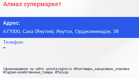 Алмаз, супермаркет по адресу 677000, Саха (Якутия), Якутск, Орджоникидзе, 38 в дальнейшем Организация, размещена в следующих категориях: