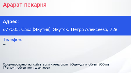 Арарат, пекарня по адресу 677005, Саха (Якутия), Якутск, Петра Алексеева, 72в в дальнейшем Организация, размещена в следующих категориях: