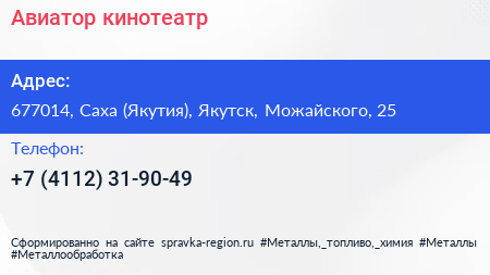 Авиатор, кинотеатр по адресу 677014, Саха (Якутия), Якутск, Можайского, 25 в дальнейшем Организация, размещена в следующих категориях: