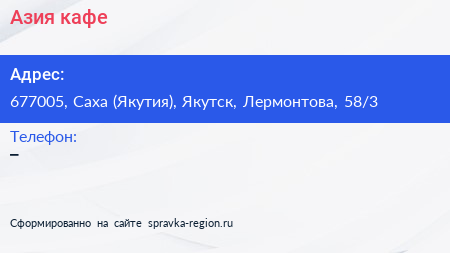 Азия, кафе по адресу 677005, Саха (Якутия), Якутск, Лермонтова, 58/3 в дальнейшем Организация, размещена в следующих категориях: