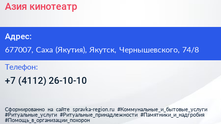 Азия, кинотеатр по адресу 677007, Саха (Якутия), Якутск, Чернышевского, 74/8 в дальнейшем Организация, размещена в следующих категориях: