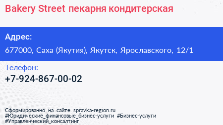 Bakery Street, пекарня-кондитерская по адресу 677000, Саха (Якутия), Якутск, Ярославского, 12/1 в дальнейшем Организация, размещена в следующих категориях: