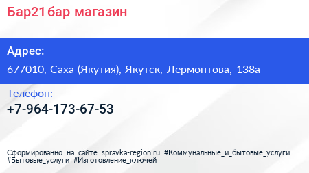 Бар21, бар-магазин по адресу 677010, Саха (Якутия), Якутск, Лермонтова, 138а в дальнейшем Организация, размещена в следующих категориях: