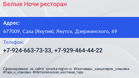 Белые Ночи, ресторан по адресу 677009, Саха (Якутия), Якутск, Дзержинского, 69 в дальнейшем Организация, размещена в следующих категориях: