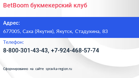 BetBoom, букмекерский клуб по адресу 677005, Саха (Якутия), Якутск, Стадухина, 83 в дальнейшем Организация, размещена в следующих категориях: