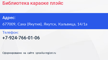 Библиотека, караоке-плэйс по адресу 677009, Саха (Якутия), Якутск, Кальвица, 14/1а в дальнейшем Организация, размещена в следующих категориях:
