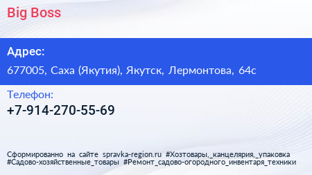 Big Boss по адресу 677005, Саха (Якутия), Якутск, Лермонтова, 64с в дальнейшем Организация, размещена в следующих категориях: