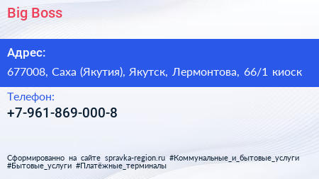 Big Boss по адресу 677008, Саха (Якутия), Якутск, Лермонтова, 66/1 киоск в дальнейшем Организация, размещена в следующих категориях: