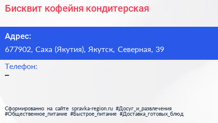 Бисквит, кофейня-кондитерская по адресу 677902, Саха (Якутия), Якутск, Северная, 39 в дальнейшем Организация, размещена в следующих категориях: