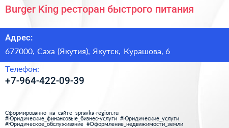 Burger King, ресторан быстрого питания по адресу 677000, Саха (Якутия), Якутск, Курашова, 6 в дальнейшем Организация, размещена в следующих категориях: