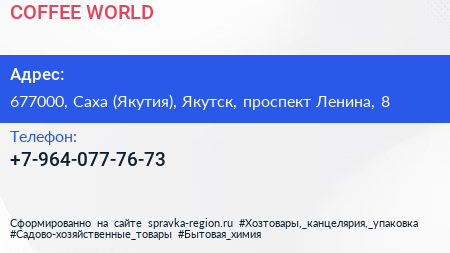 COFFEE WORLD по адресу 677000, Саха (Якутия), Якутск, проспект Ленина, 8 в дальнейшем Организация, размещена в следующих категориях: