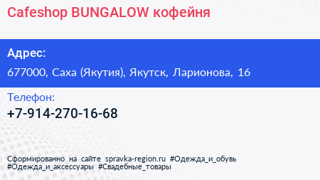 Cafeshop BUNGALOW, кофейня по адресу 677000, Саха (Якутия), Якутск, Ларионова, 16 в дальнейшем Организация, размещена в следующих категориях: