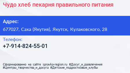 Чудо хлеб, пекарня правильного питания по адресу 677027, Саха (Якутия), Якутск, Кулаковского, 28 в дальнейшем Организация, размещена в следующих категориях: