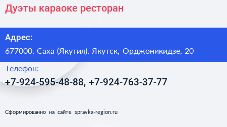 Дуэты, караоке-ресторан по адресу 677000, Саха (Якутия), Якутск, Орджоникидзе, 20 в дальнейшем Организация, размещена в следующих категориях: