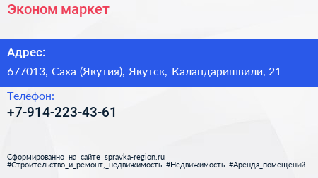 Эконом-маркет по адресу 677013, Саха (Якутия), Якутск, Каландаришвили, 21 в дальнейшем Организация, размещена в следующих категориях: