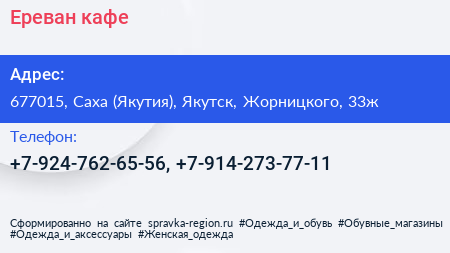 Ереван, кафе по адресу 677015, Саха (Якутия), Якутск, Жорницкого, 33ж в дальнейшем Организация, размещена в следующих категориях: