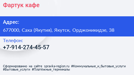 Фартук, кафе по адресу 677000, Саха (Якутия), Якутск, Орджоникидзе, 38 в дальнейшем Организация, размещена в следующих категориях: