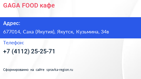 GAGA FOOD, кафе по адресу 677014, Саха (Якутия), Якутск, Кузьмина, 34в в дальнейшем Организация, размещена в следующих категориях: