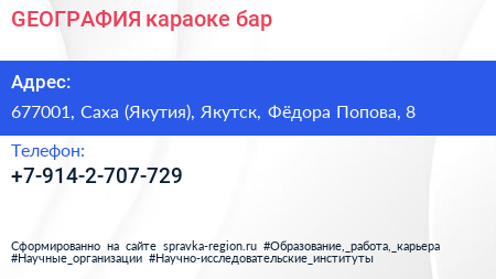GЕОГРАФИЯ, караоке-бар по адресу 677001, Саха (Якутия), Якутск, Фёдора Попова, 8 в дальнейшем Организация, размещена в следующих категориях: