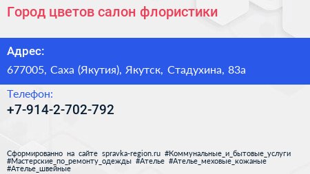Город цветов, салон флористики по адресу 677005, Саха (Якутия), Якутск, Стадухина, 83а в дальнейшем Организация, размещена в следующих категориях: