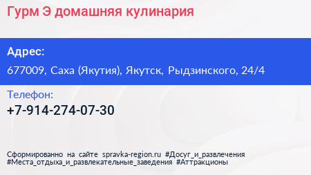 Гурм`Э, домашняя кулинария по адресу 677009, Саха (Якутия), Якутск, Рыдзинского, 24/4 в дальнейшем Организация, размещена в следующих категориях:
