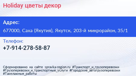 Holiday цветы & декор по адресу 677000, Саха (Якутия), Якутск, 203-й микрорайон, 35/1 в дальнейшем Организация, размещена в следующих категориях: