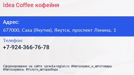 Idea Coffee, кофейня по адресу 677000, Саха (Якутия), Якутск, проспект Ленина, 1 в дальнейшем Организация, размещена в следующих категориях: