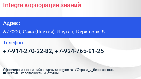 Integra, корпорация знаний по адресу 677000, Саха (Якутия), Якутск, Курашова, 8 в дальнейшем Организация, размещена в следующих категориях: