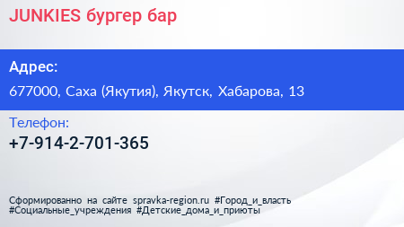 JUNKIES, бургер-бар по адресу 677000, Саха (Якутия), Якутск, Хабарова, 13 в дальнейшем Организация, размещена в следующих категориях: