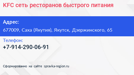 KFC, сеть ресторанов быстрого питания по адресу 677009, Саха (Якутия), Якутск, Дзержинского, 65 в дальнейшем Организация, размещена в следующих категориях: