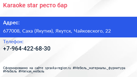 Karaoke star, ресто-бар по адресу 677008, Саха (Якутия), Якутск, Чайковского, 22 в дальнейшем Организация, размещена в следующих категориях: