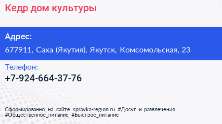Кедр, дом культуры по адресу 677911, Саха (Якутия), Якутск, Комсомольская, 23 в дальнейшем Организация, размещена в следующих категориях: