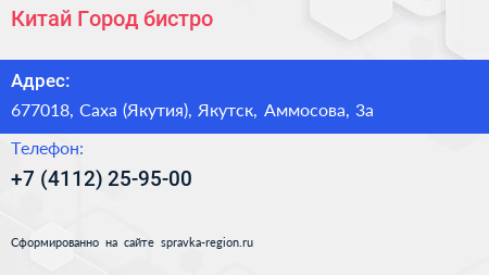 Китай Город, бистро по адресу 677018, Саха (Якутия), Якутск, Аммосова, 3а в дальнейшем Организация, размещена в следующих категориях: