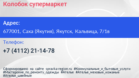 Колобок, супермаркет по адресу 677001, Саха (Якутия), Якутск, Кальвица, 7/1в в дальнейшем Организация, размещена в следующих категориях: