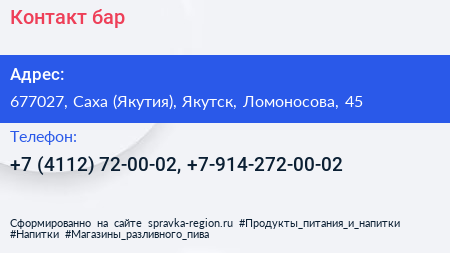 Контакт, бар по адресу 677027, Саха (Якутия), Якутск, Ломоносова, 45 в дальнейшем Организация, размещена в следующих категориях: