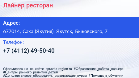 Лайнер, ресторан по адресу 677014, Саха (Якутия), Якутск, Быковского, 7 в дальнейшем Организация, размещена в следующих категориях: