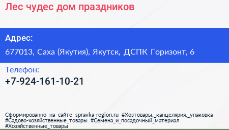 Лес чудес, дом праздников по адресу 677013, Саха (Якутия), Якутск, ДСПК Горизонт, 6 в дальнейшем Организация, размещена в следующих категориях: