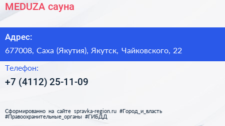 MEDUZA, сауна по адресу 677008, Саха (Якутия), Якутск, Чайковского, 22 в дальнейшем Организация, размещена в следующих категориях: