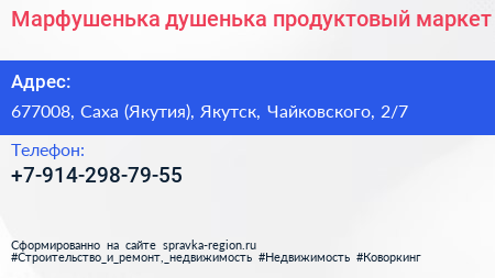 Марфушенька-душенька, продуктовый маркет по адресу 677008, Саха (Якутия), Якутск, Чайковского, 2/7 в дальнейшем Организация, размещена в следующих категориях: