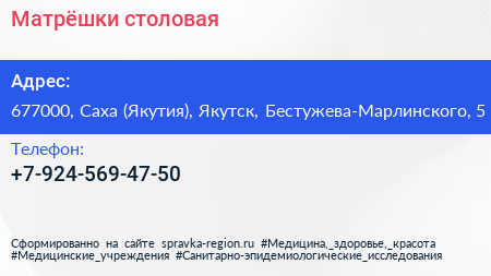 Матрёшки, столовая по адресу 677000, Саха (Якутия), Якутск, Бестужева-Марлинского, 5 в дальнейшем Организация, размещена в следующих категориях: