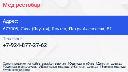 Мёд, рестобар по адресу 677005, Саха (Якутия), Якутск, Петра Алексеева, 81 в дальнейшем Организация, размещена в следующих категориях:
