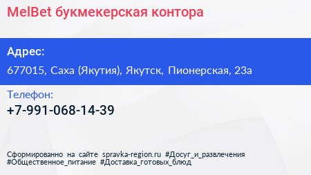 MelBet, букмекерская контора по адресу 677015, Саха (Якутия), Якутск, Пионерская, 23а в дальнейшем Организация, размещена в следующих категориях: