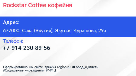 Rockstar Coffee, кофейня по адресу 677000, Саха (Якутия), Якутск, Курашова, 29а в дальнейшем Организация, размещена в следующих категориях: