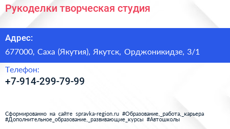 Рукоделки, творческая студия по адресу 677000, Саха (Якутия), Якутск, Орджоникидзе, 3/1 в дальнейшем Организация, размещена в следующих категориях: