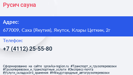 Русич, сауна по адресу 677009, Саха (Якутия), Якутск, Клары Цеткин, 2г в дальнейшем Организация, размещена в следующих категориях: