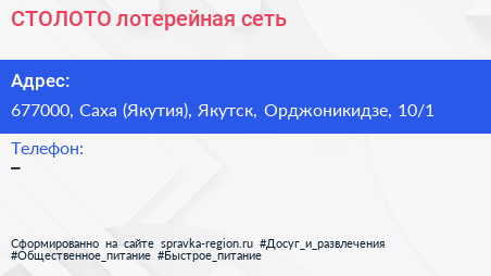 СТОЛОТО, лотерейная сеть по адресу 677000, Саха (Якутия), Якутск, Орджоникидзе, 10/1 в дальнейшем Организация, размещена в следующих категориях: