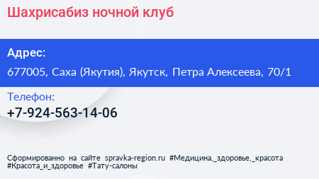 Шахрисабиз, ночной клуб по адресу 677005, Саха (Якутия), Якутск, Петра Алексеева, 70/1 в дальнейшем Организация, размещена в следующих категориях: