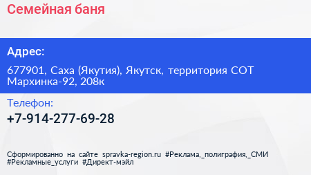 Семейная баня по адресу 677901, Саха (Якутия), Якутск, территория СОТ Мархинка-92, 208к в дальнейшем Организация, размещена в следующих категориях: