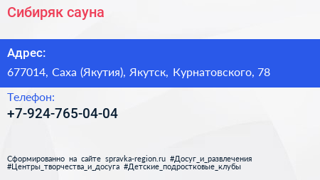 Сибиряк, сауна по адресу 677014, Саха (Якутия), Якутск, Курнатовского, 78 в дальнейшем Организация, размещена в следующих категориях: