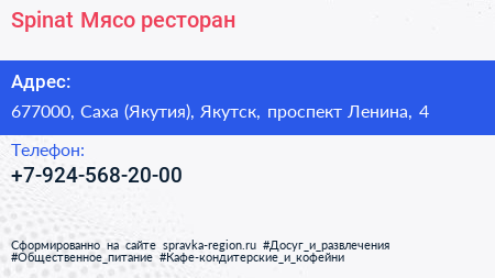 Spinat & Мясо, ресторан по адресу 677000, Саха (Якутия), Якутск, проспект Ленина, 4 в дальнейшем Организация, размещена в следующих категориях: